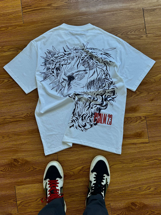 The Praise Tee features a powerful line-art illustration of Christ crowned with thorns and the embroidered message “PSALM 23” a reminder that you’re never walking alone.